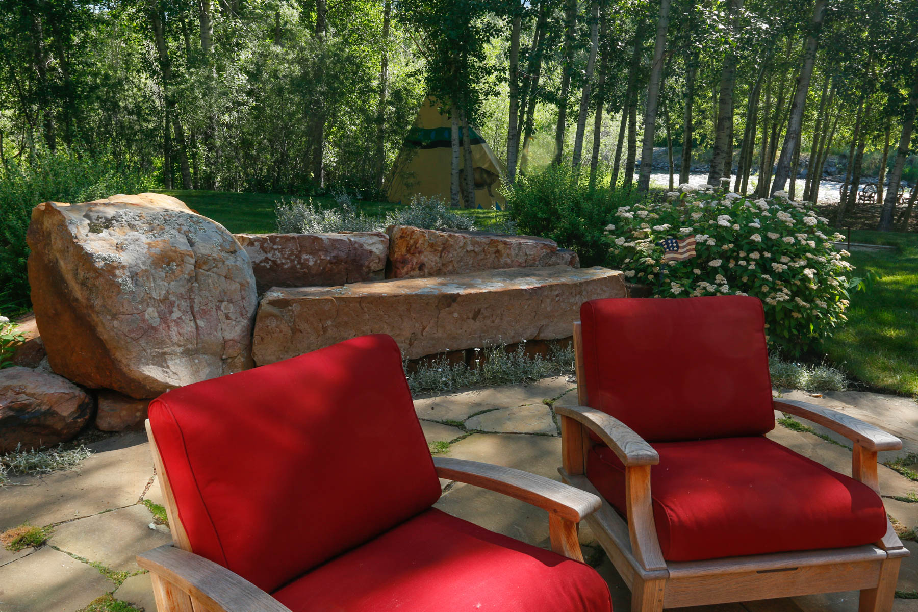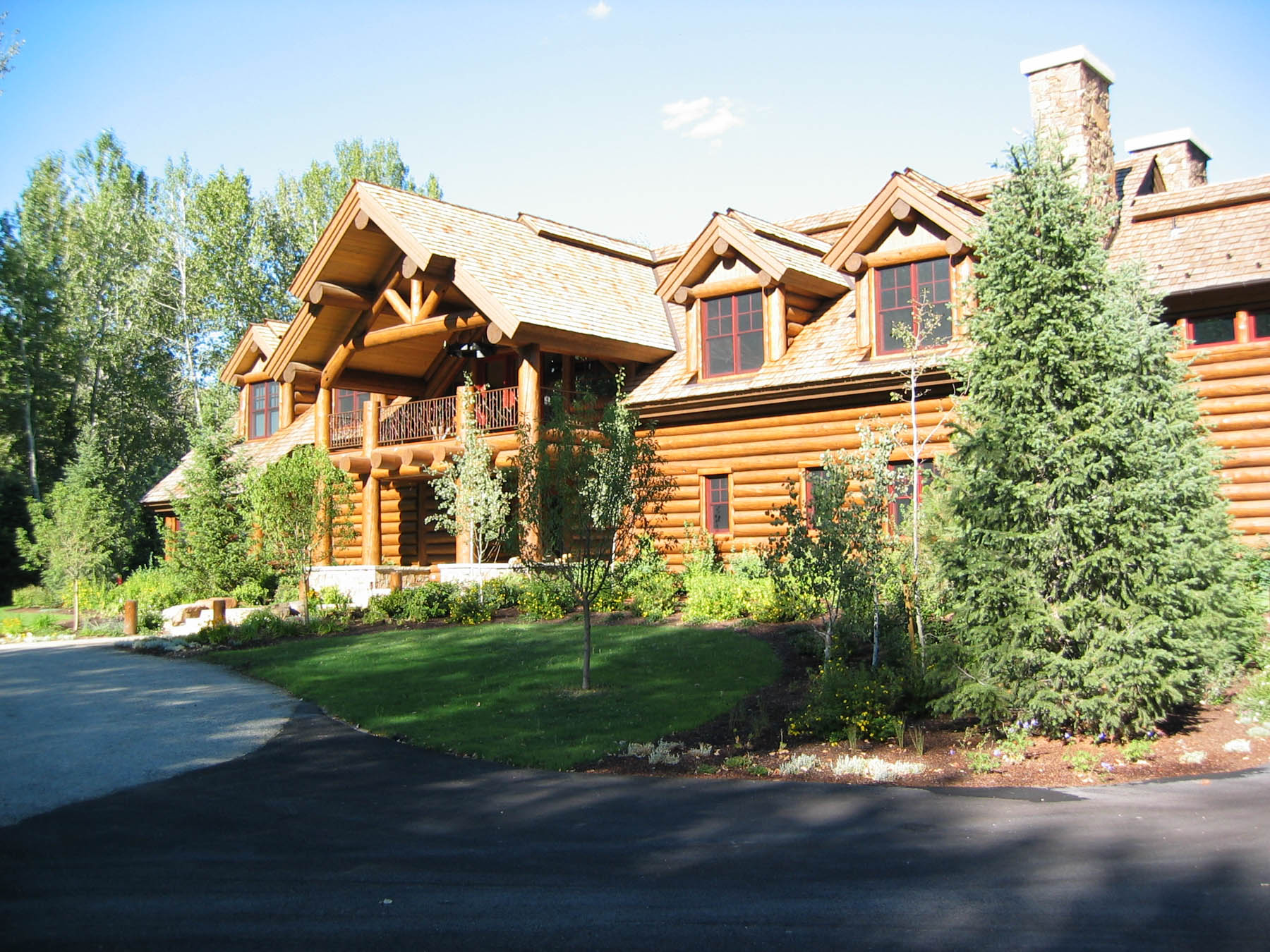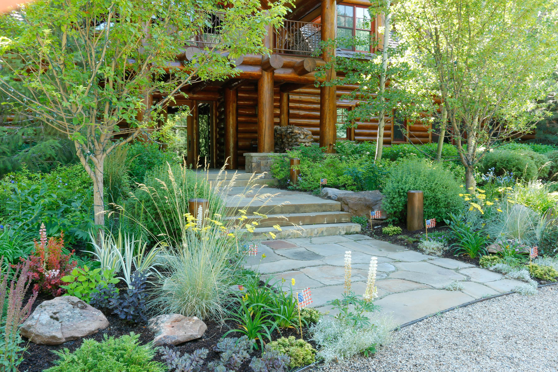 This riverfront property required special consideration to meet regulations for flood plain, wetlands, and riparian areas. The home needed to be elevated and so one of our big tasks was to make a smooth and pleasurable transitions to the house. With this in mind, large boulders and stone slab step were added to access the front elevation of the home, while a flagstone walkout patio at the rear of the home meets the elevated lawn area. The owners wanted to be respectful of the sensitive site so tall native grasses were used rather than a typical bluegrass lawn. Many native trees, shrubs, and flowers add to the natural setting. A custom sunken Barbeque patio with sink was added later. A pond with flowing waters that is stocked with fish provides a fun and pleasurable spot to hang out. Custom log light holders were designed to be consistent with the house.