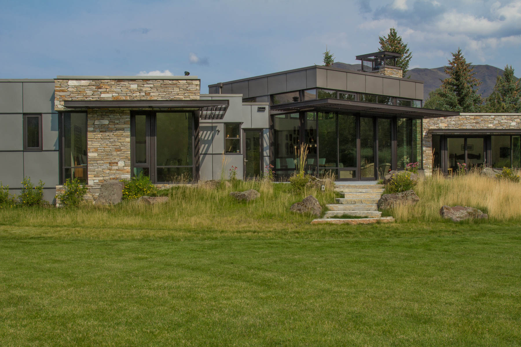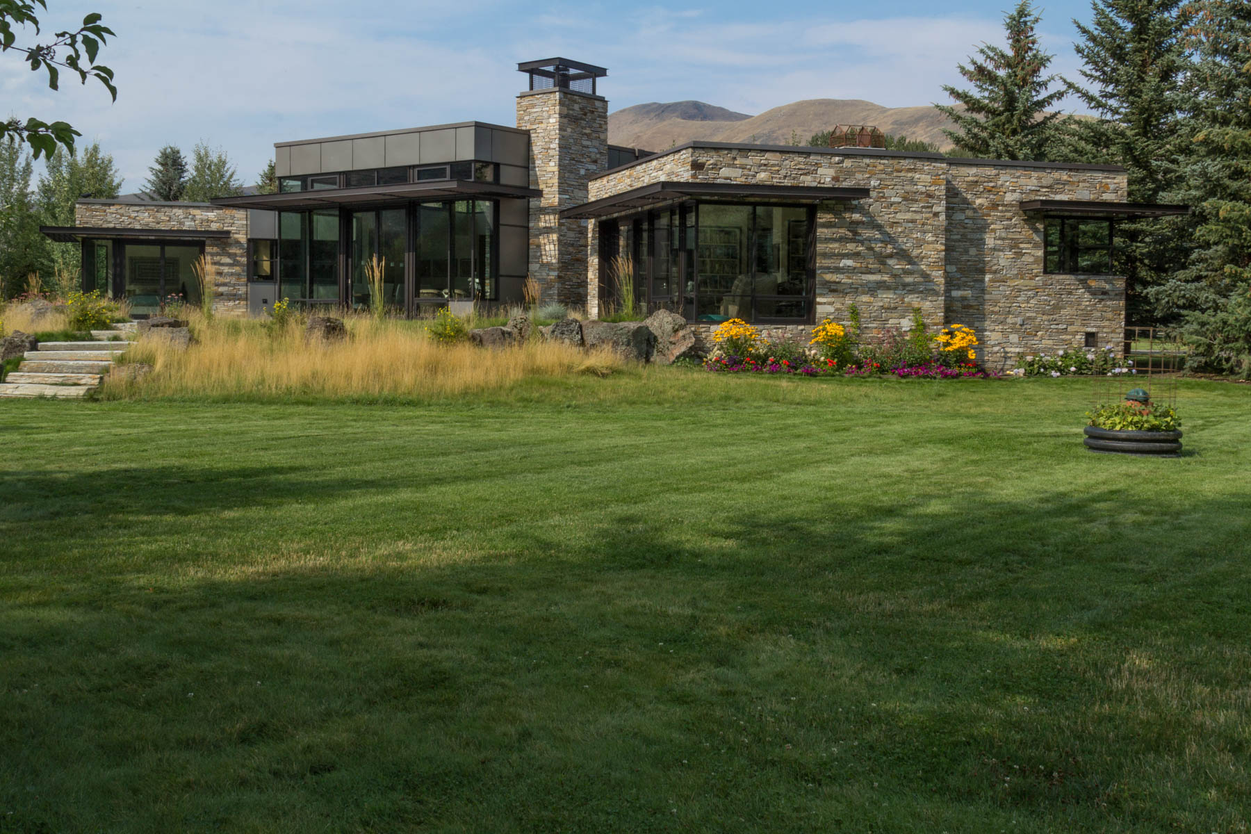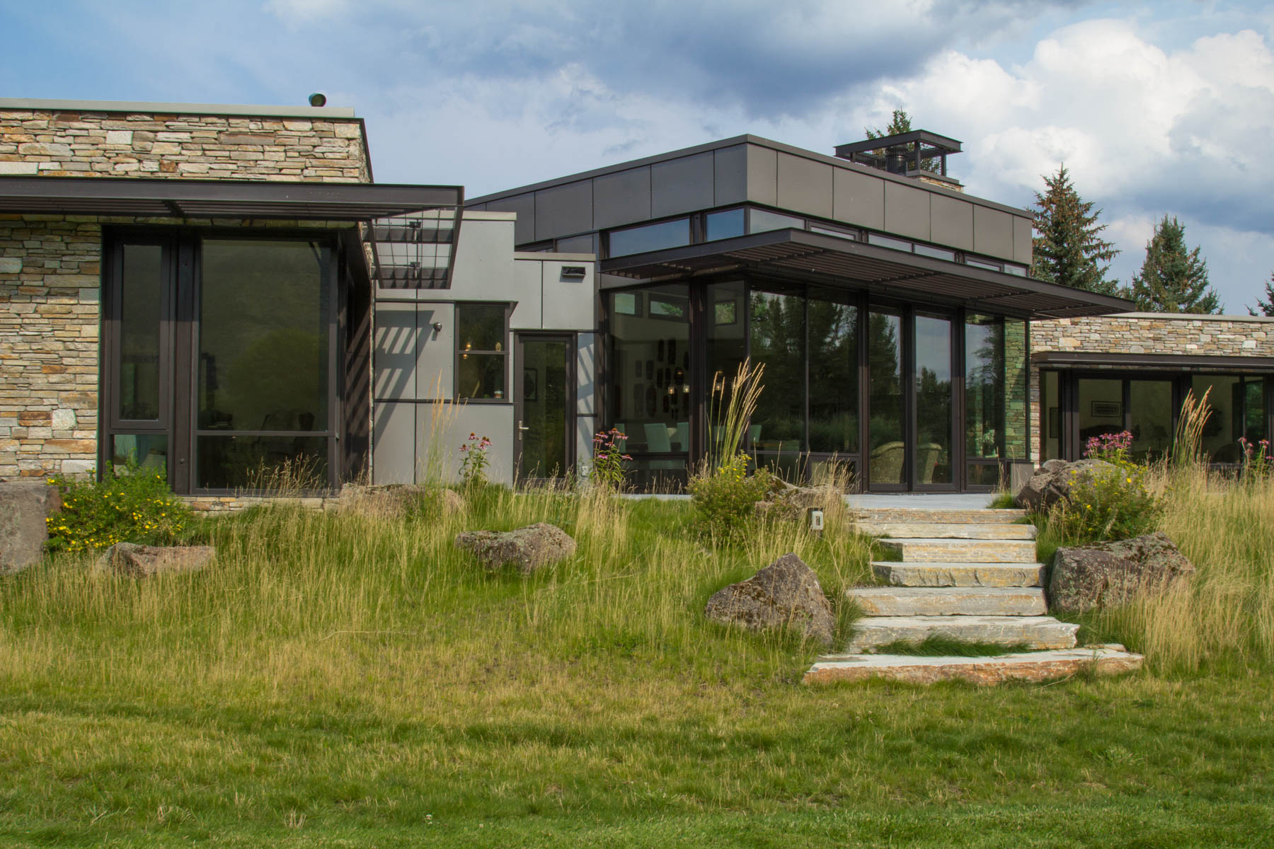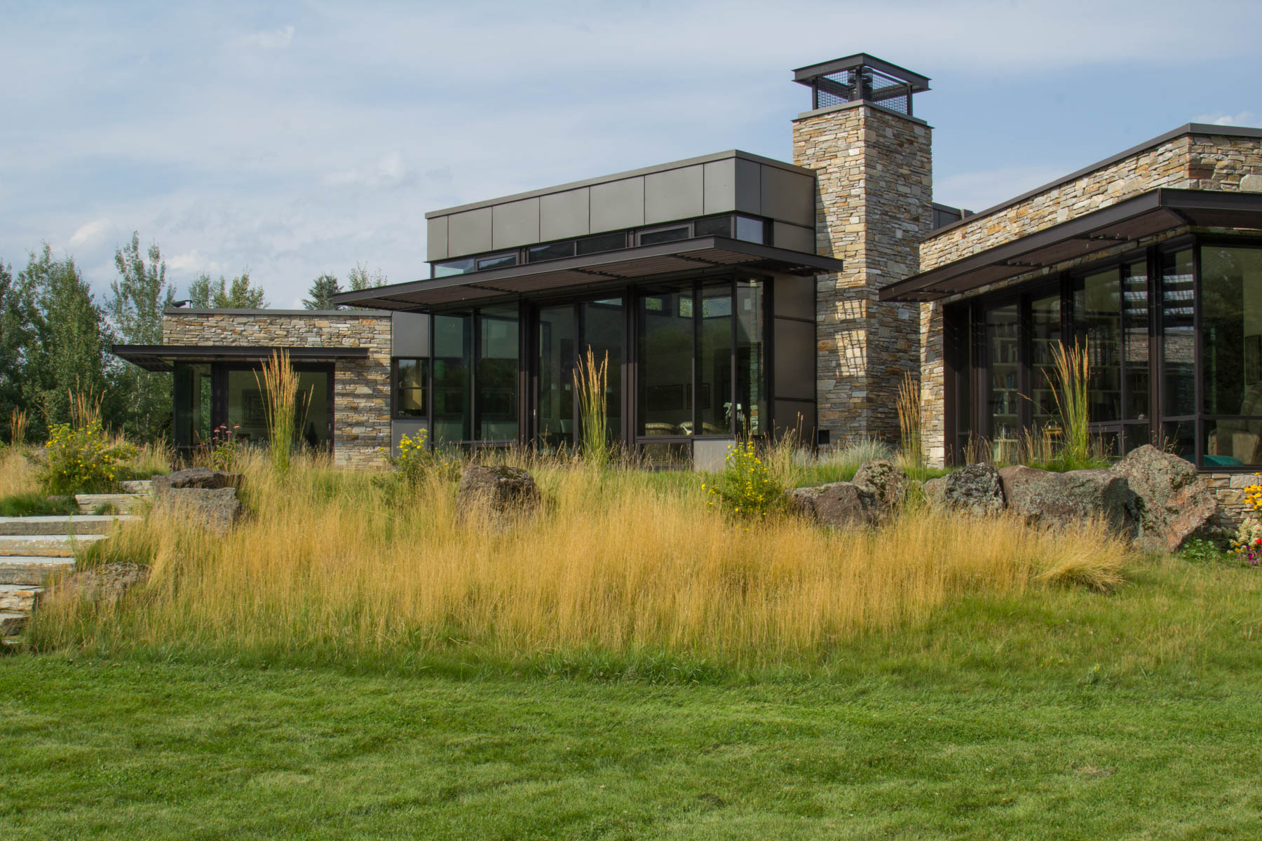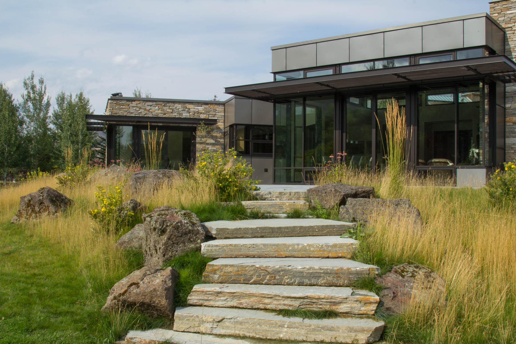 A green roof and plank pavers sets this landscape apart. The house overlooks a pond and the landscape was called upon to be visually seamless from the extensive glass in the back of the house. Boulders were chosen by hand and brought in from the nearby Snake River canyon to help facilitate the grade change of the back patio. Oakley Stone slabs, another locally sourced material, form steps that flow through down the slope.