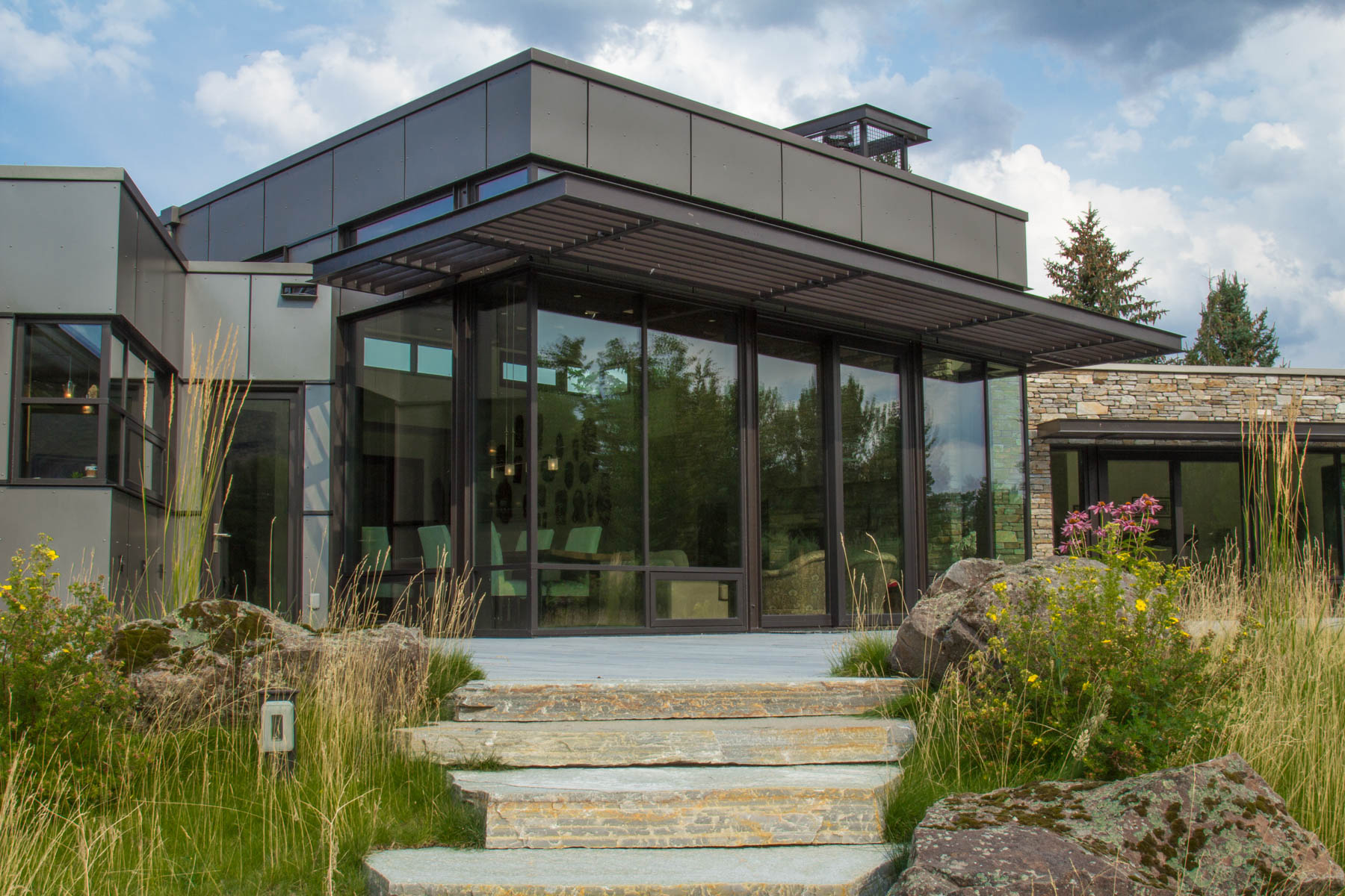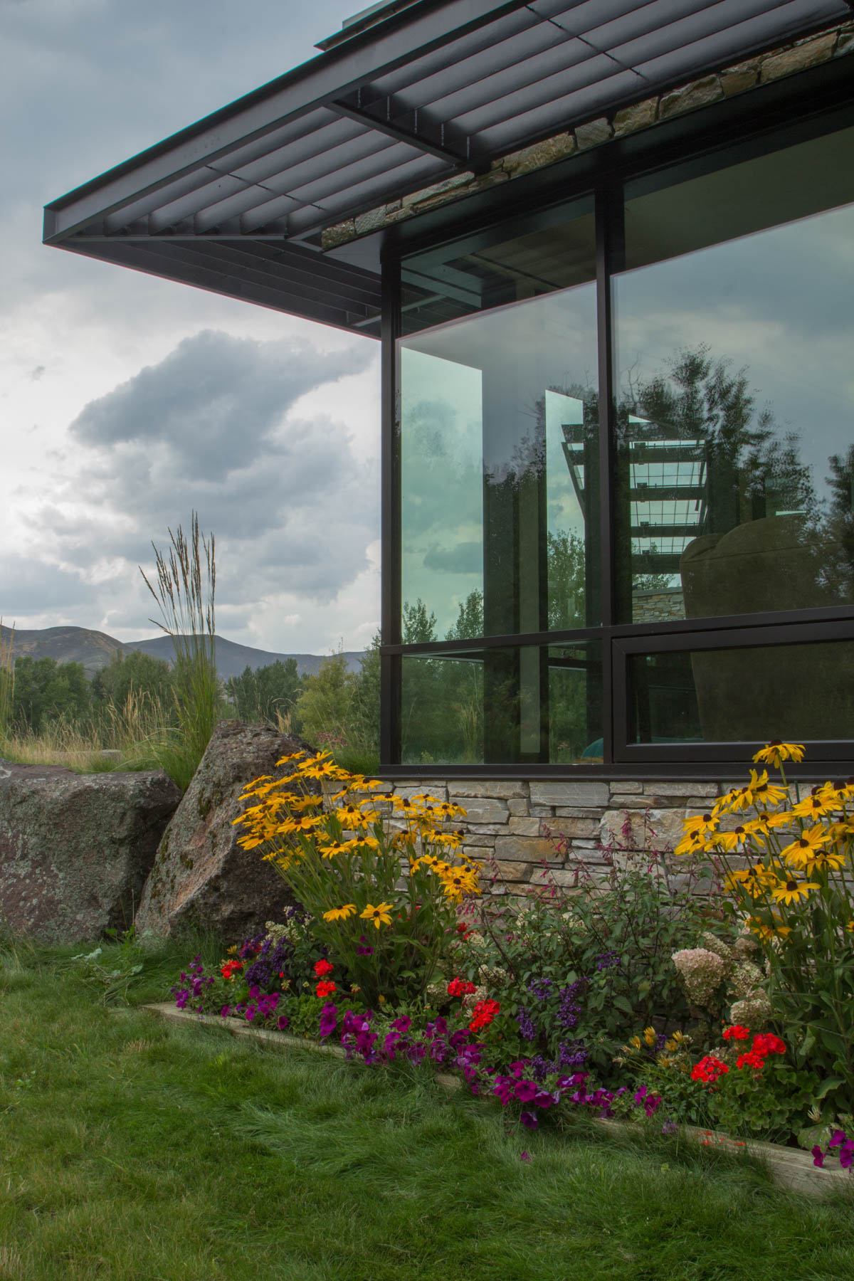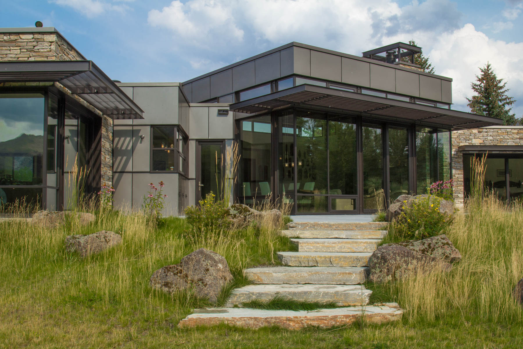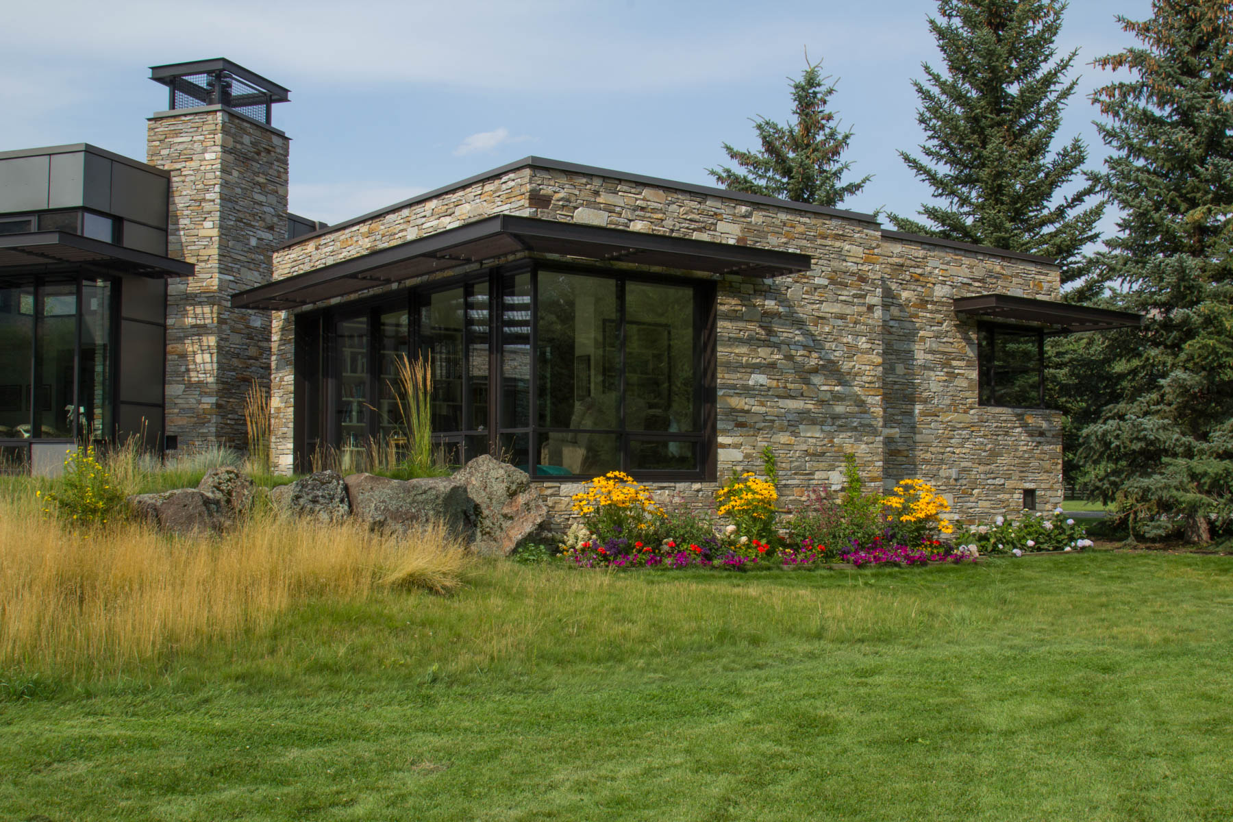 A green roof and plank pavers sets this landscape apart. The house overlooks a pond and the landscape was called upon to be visually seamless from the extensive glass in the back of the house. Boulders were chosen by hand and brought in from the nearby Snake River canyon to help facilitate the grade change of the back patio. Oakley Stone slabs, another locally sourced material, form steps that flow through down the slope.