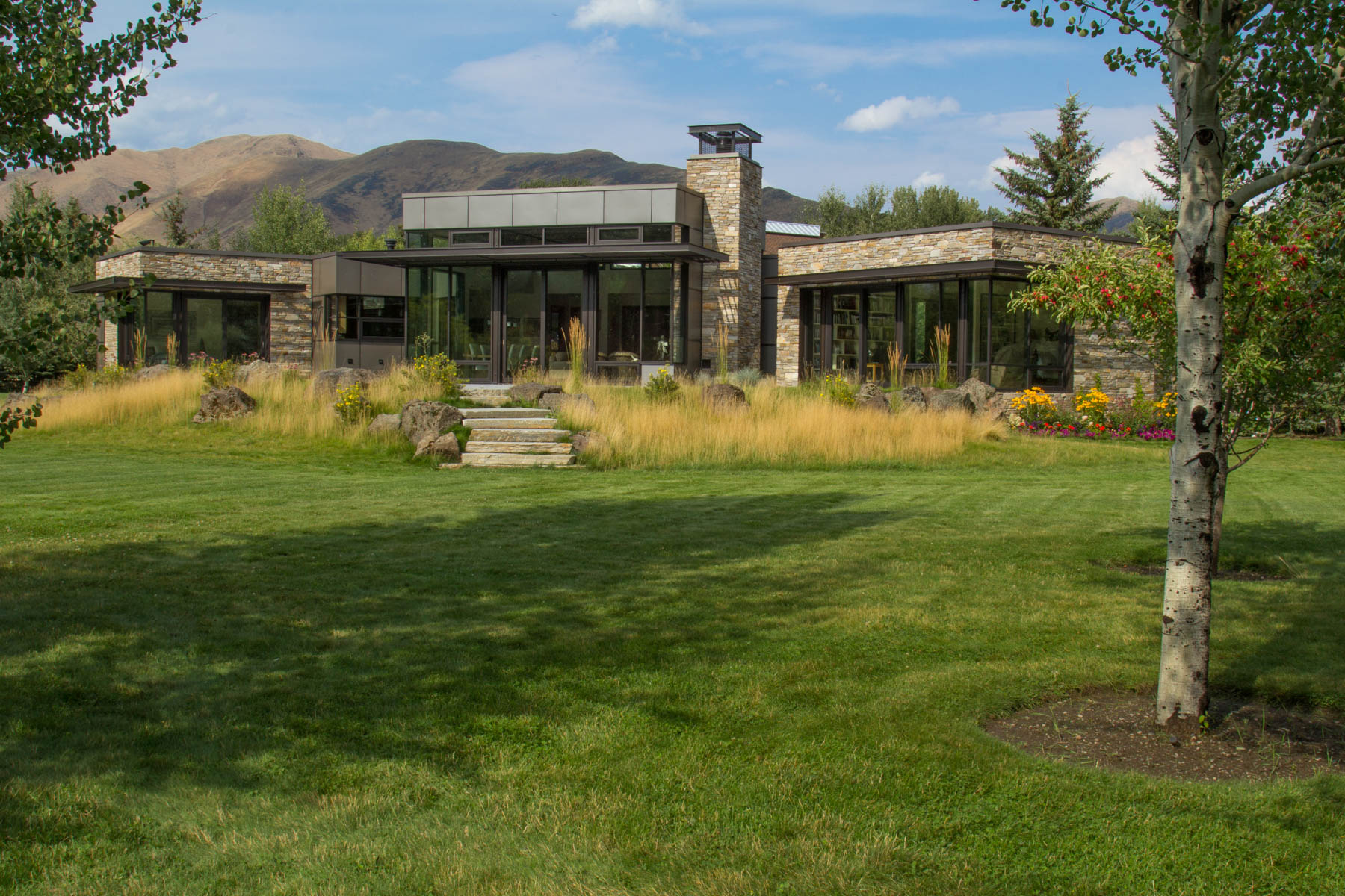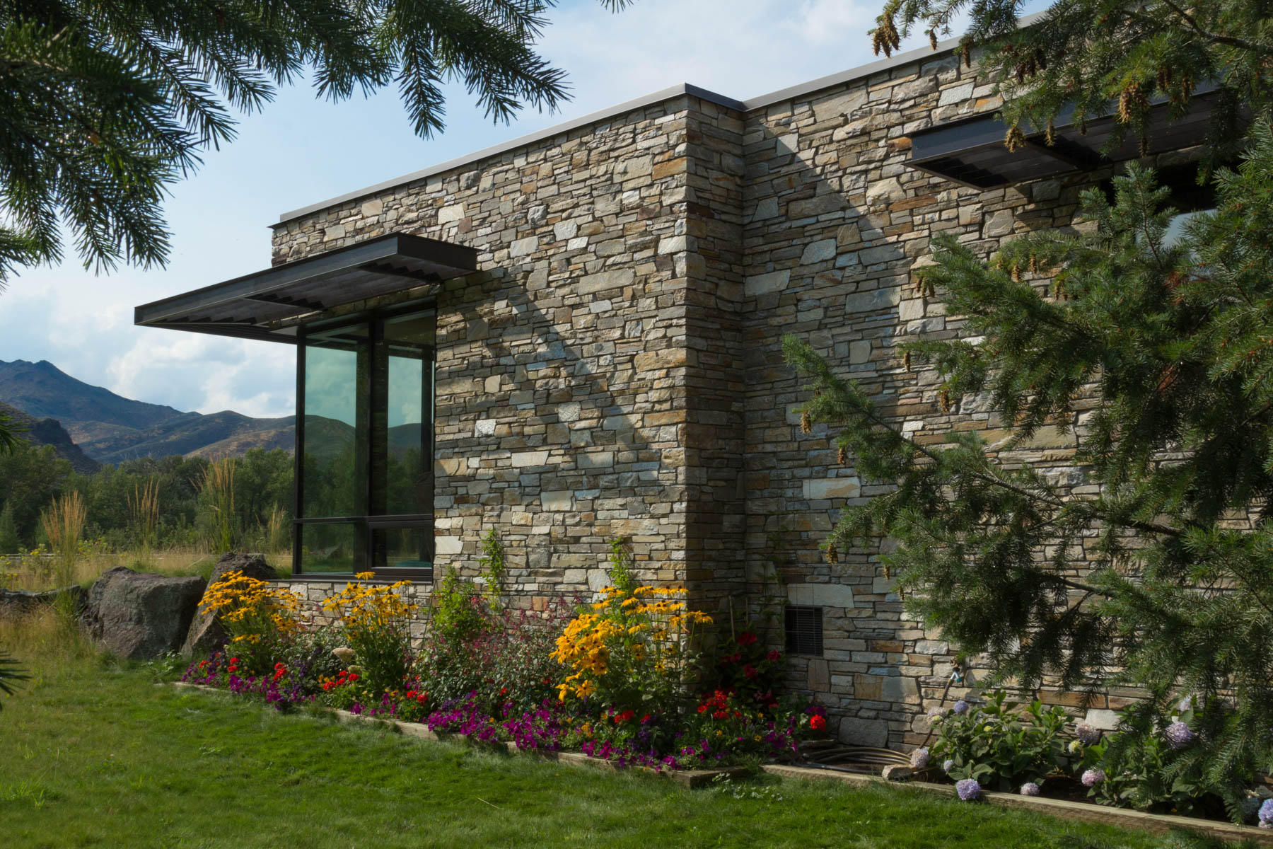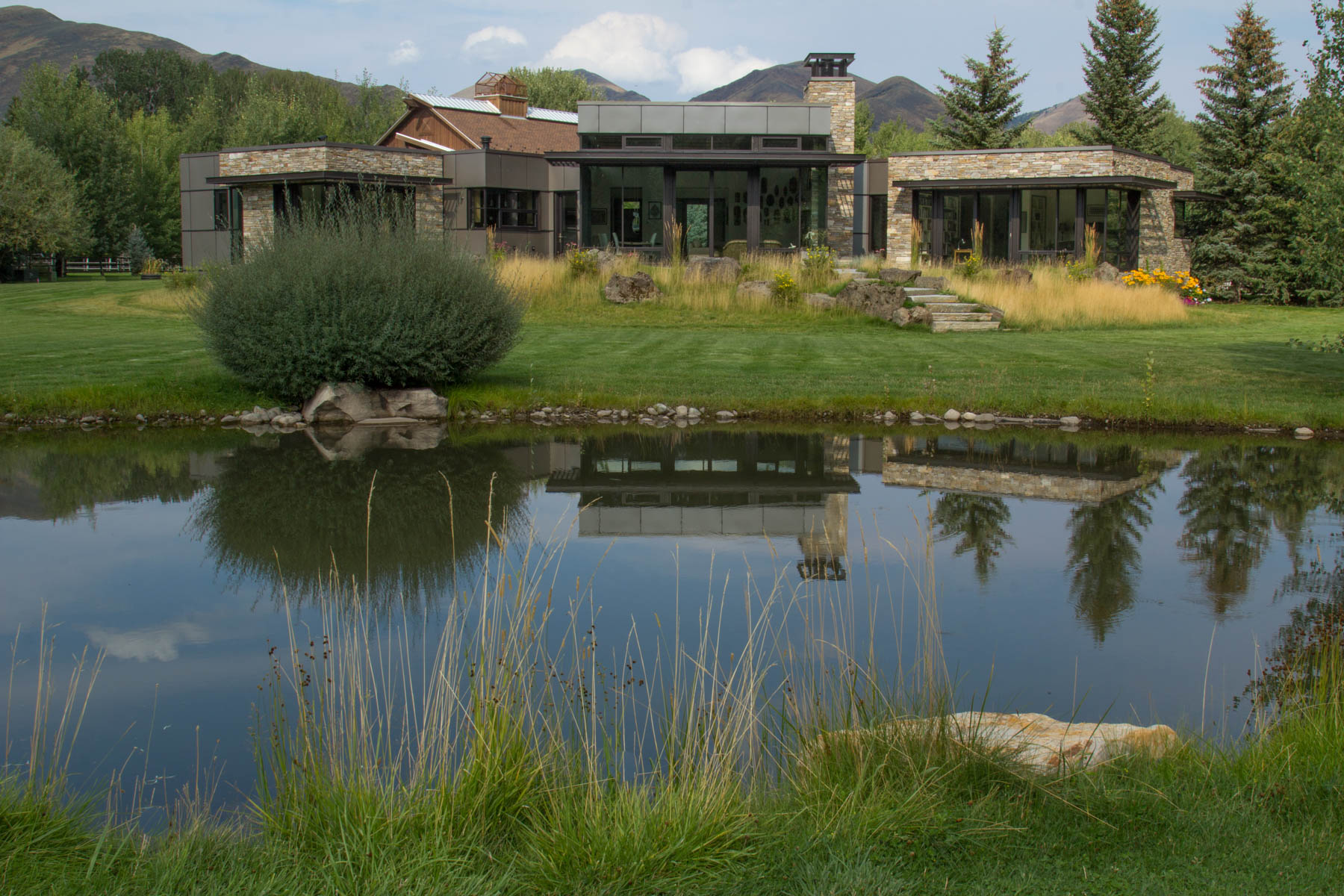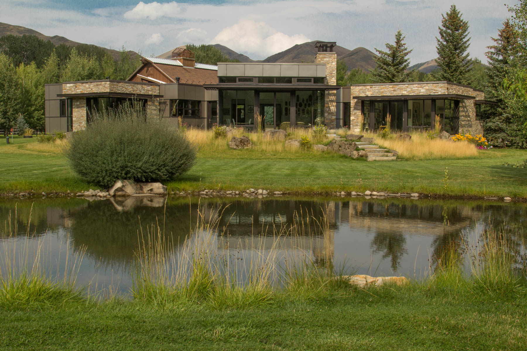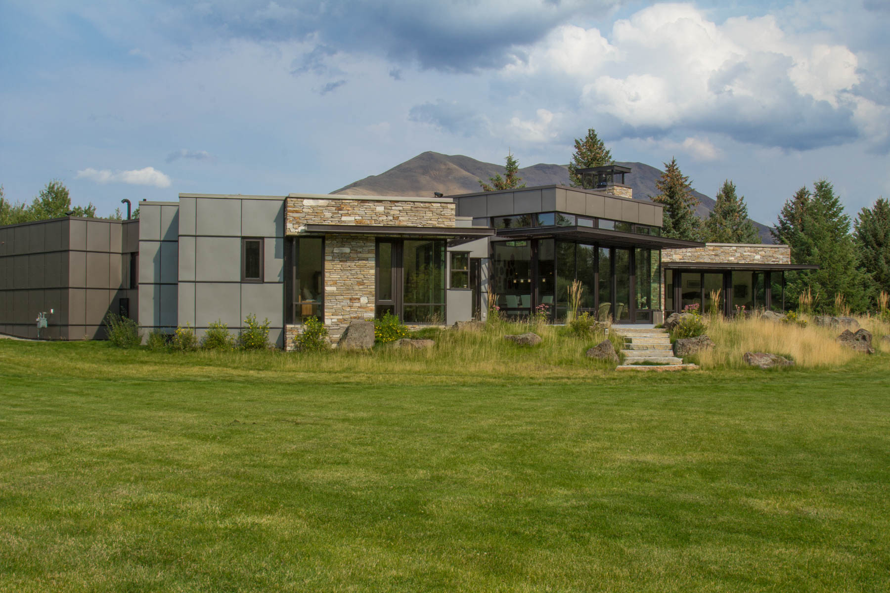 A green roof and plank pavers sets this landscape apart. The house overlooks a pond and the landscape was called upon to be visually seamless from the extensive glass in the back of the house. Boulders were chosen by hand and brought in from the nearby Snake River canyon to help facilitate the grade change of the back patio. Oakley Stone slabs, another locally sourced material, form steps that flow through down the slope.