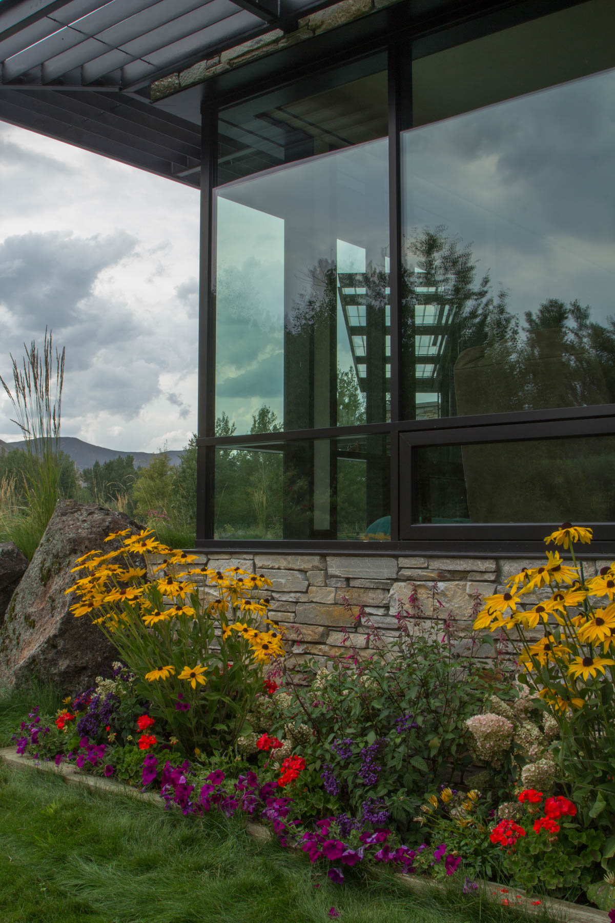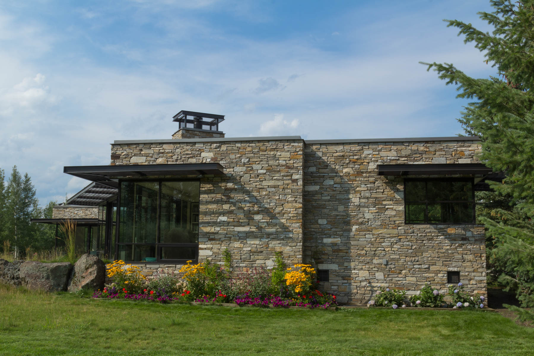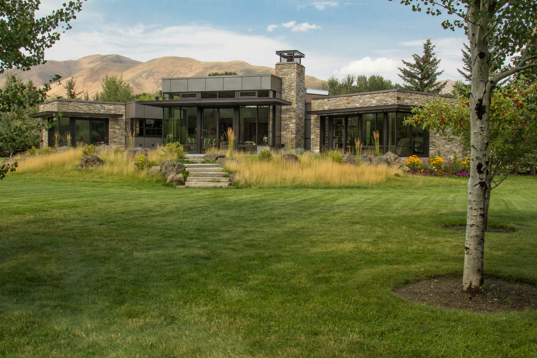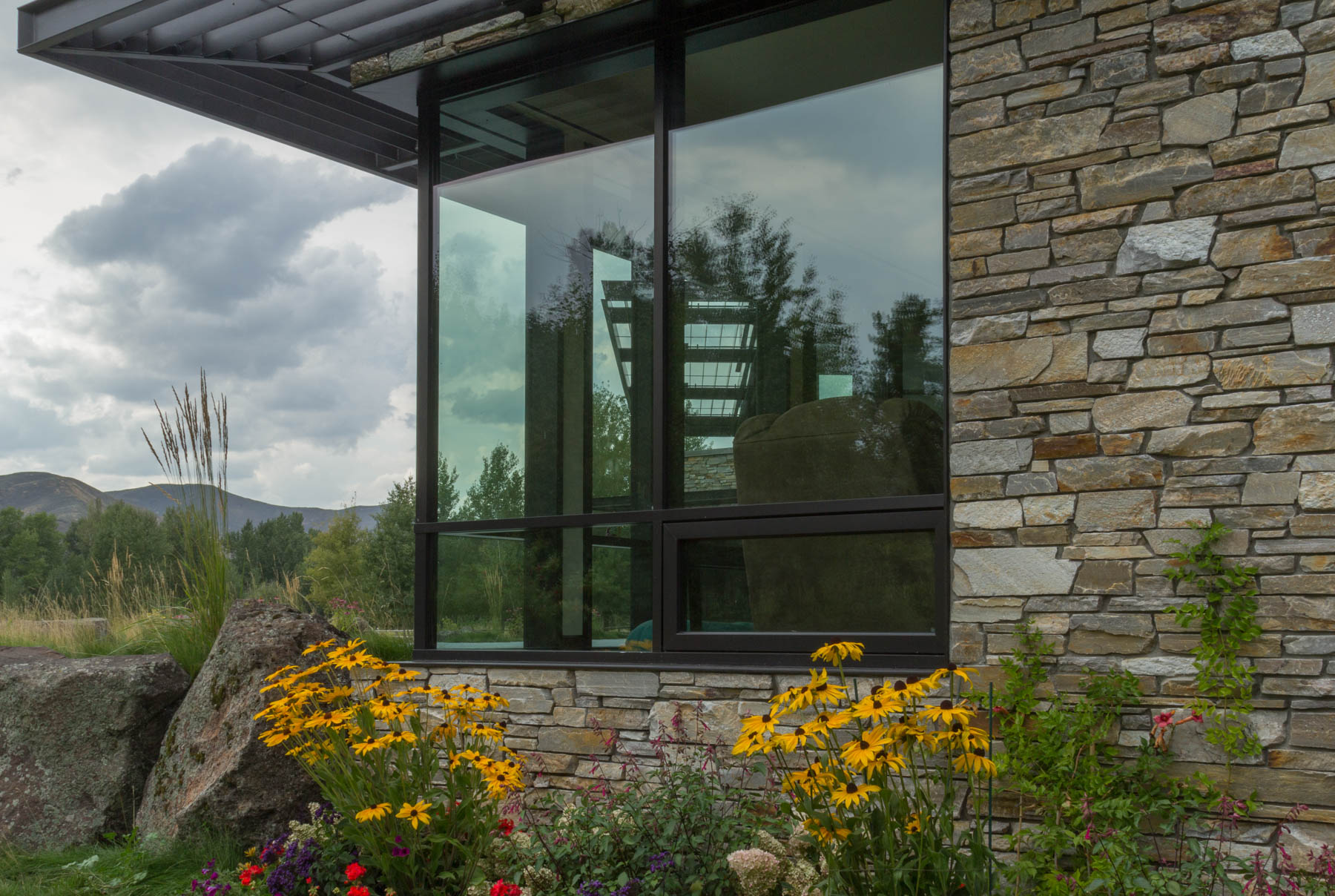 A green roof and plank pavers sets this landscape apart. The house overlooks a pond and the landscape was called upon to be visually seamless from the extensive glass in the back of the house. Boulders were chosen by hand and brought in from the nearby Snake River canyon to help facilitate the grade change of the back patio. Oakley Stone slabs, another locally sourced material, form steps that flow through down the slope.