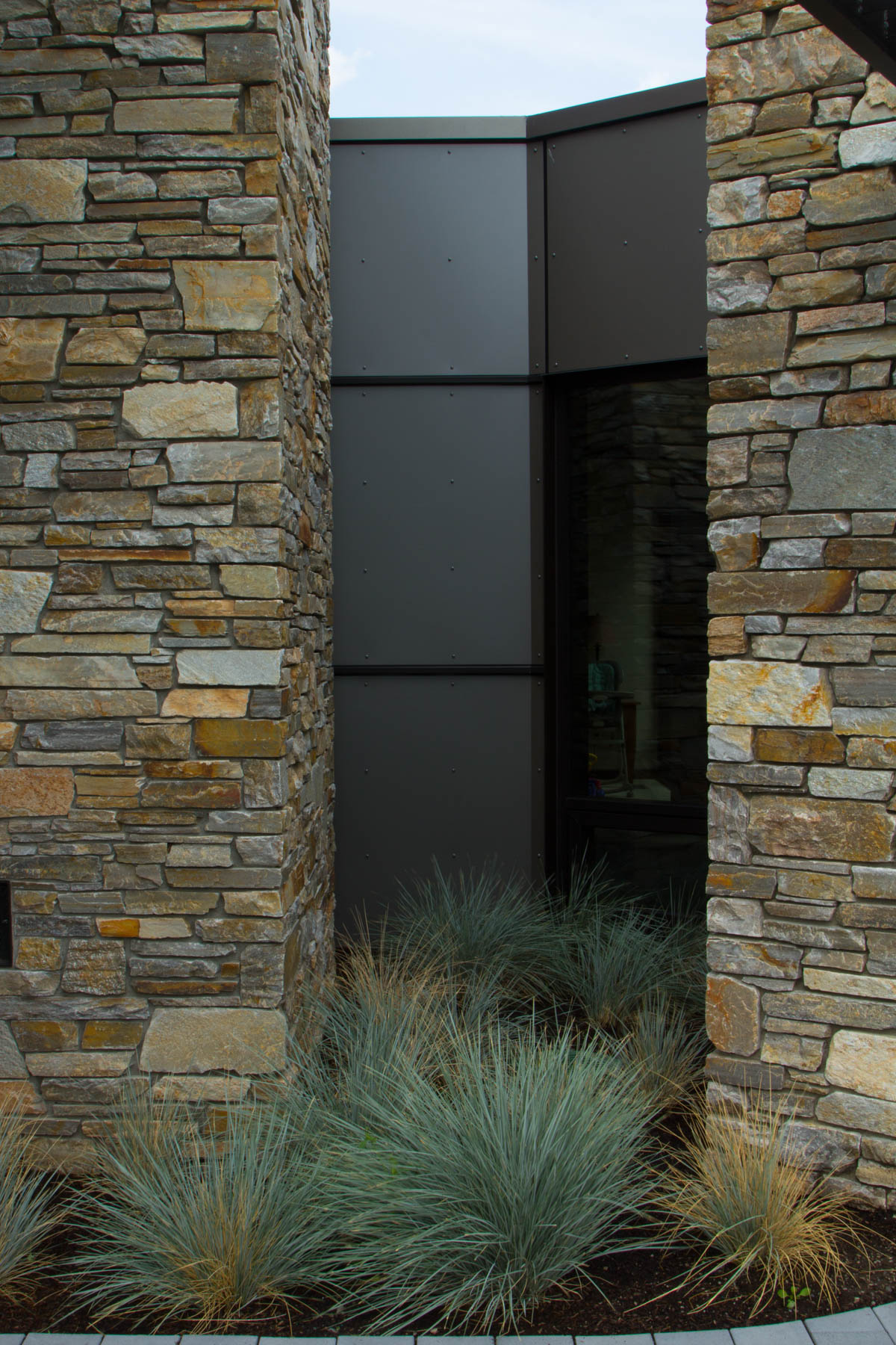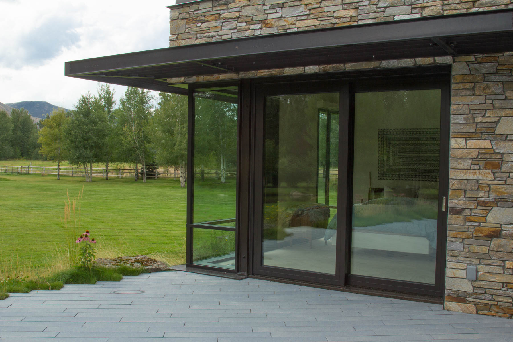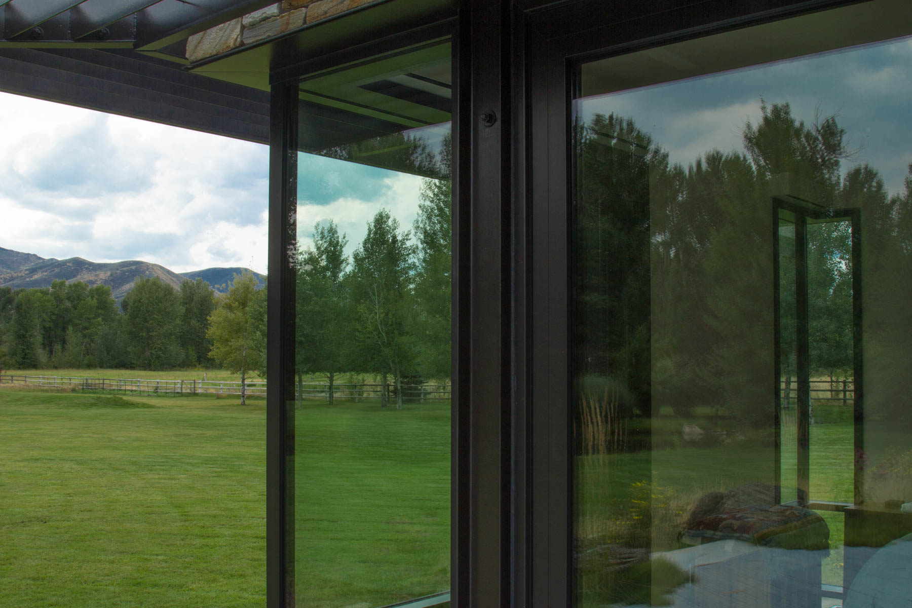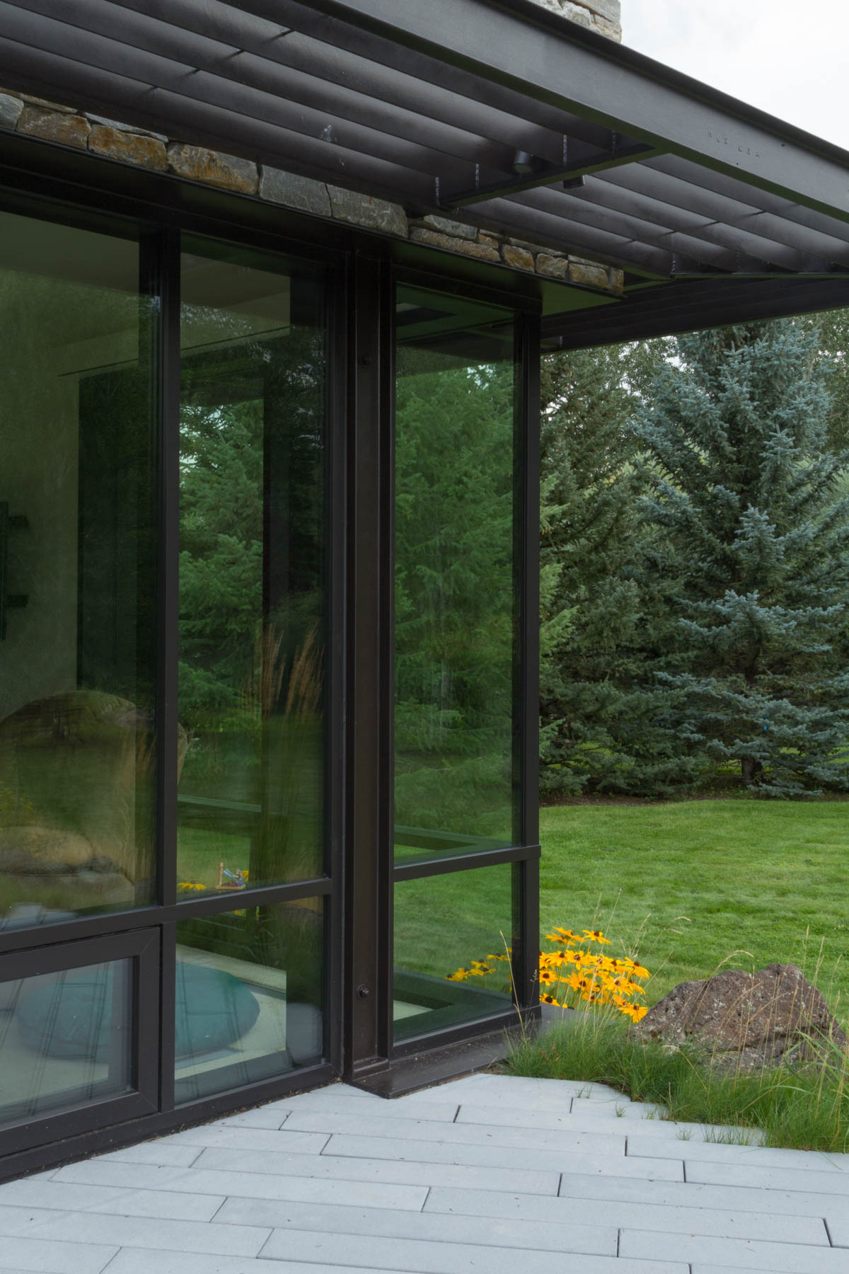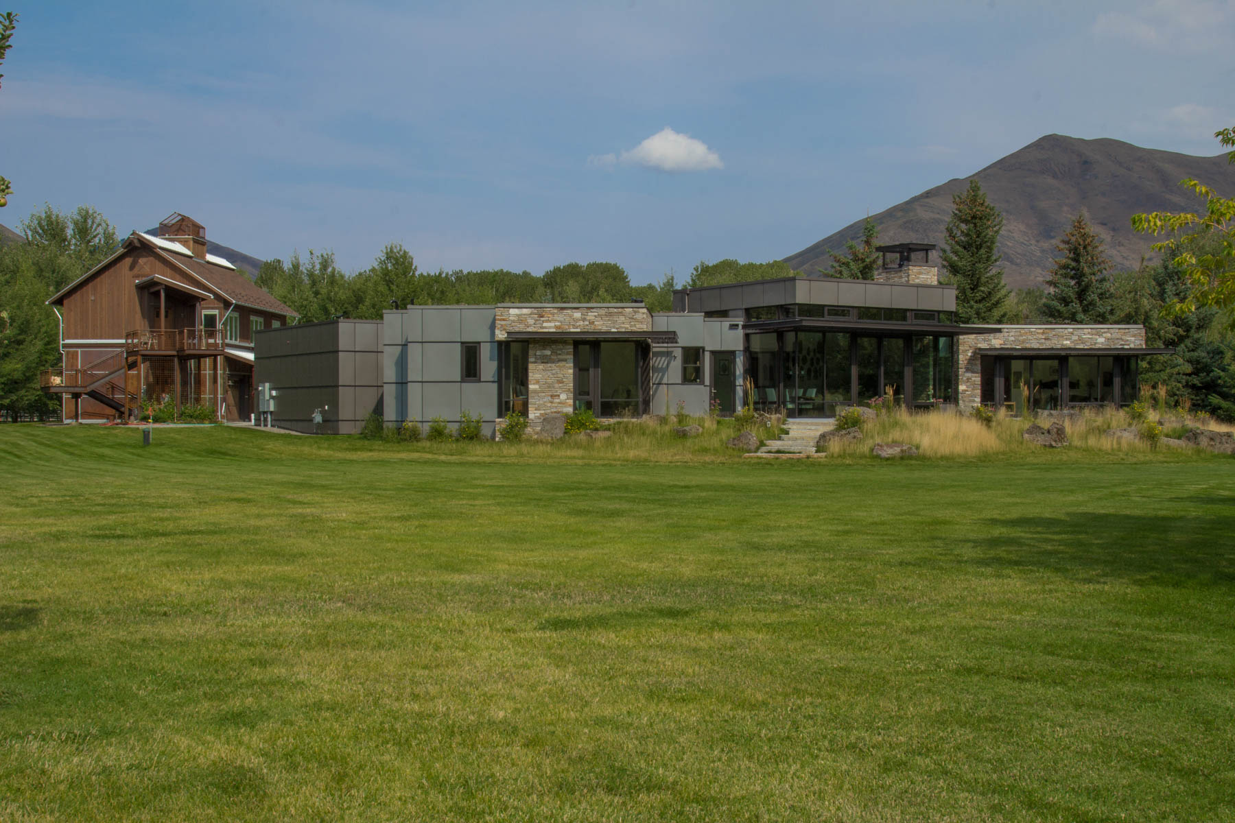 A green roof and plank pavers sets this landscape apart. The house overlooks a pond and the landscape was called upon to be visually seamless from the extensive glass in the back of the house. Boulders were chosen by hand and brought in from the nearby Snake River canyon to help facilitate the grade change of the back patio. Oakley Stone slabs, another locally sourced material, form steps that flow through down the slope.