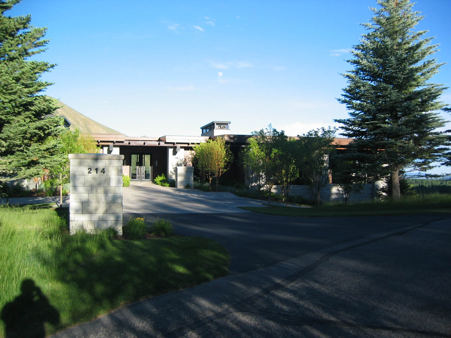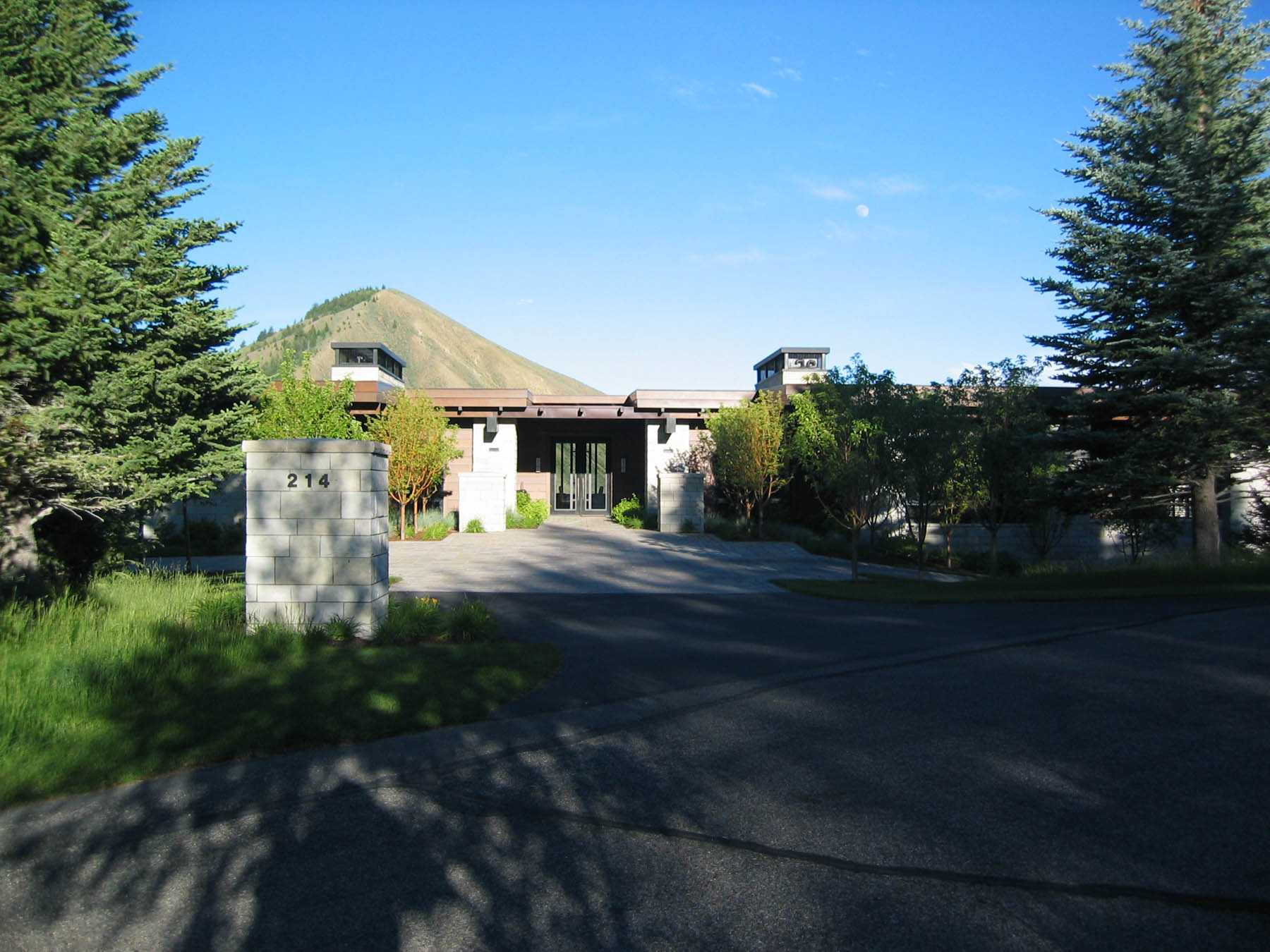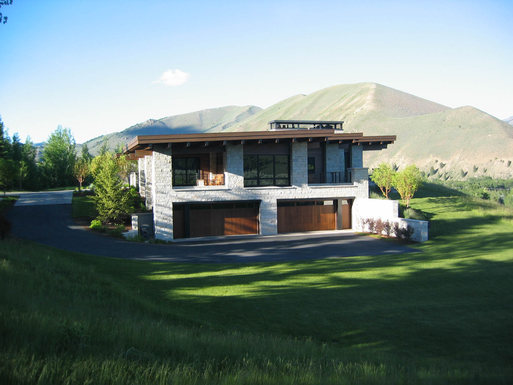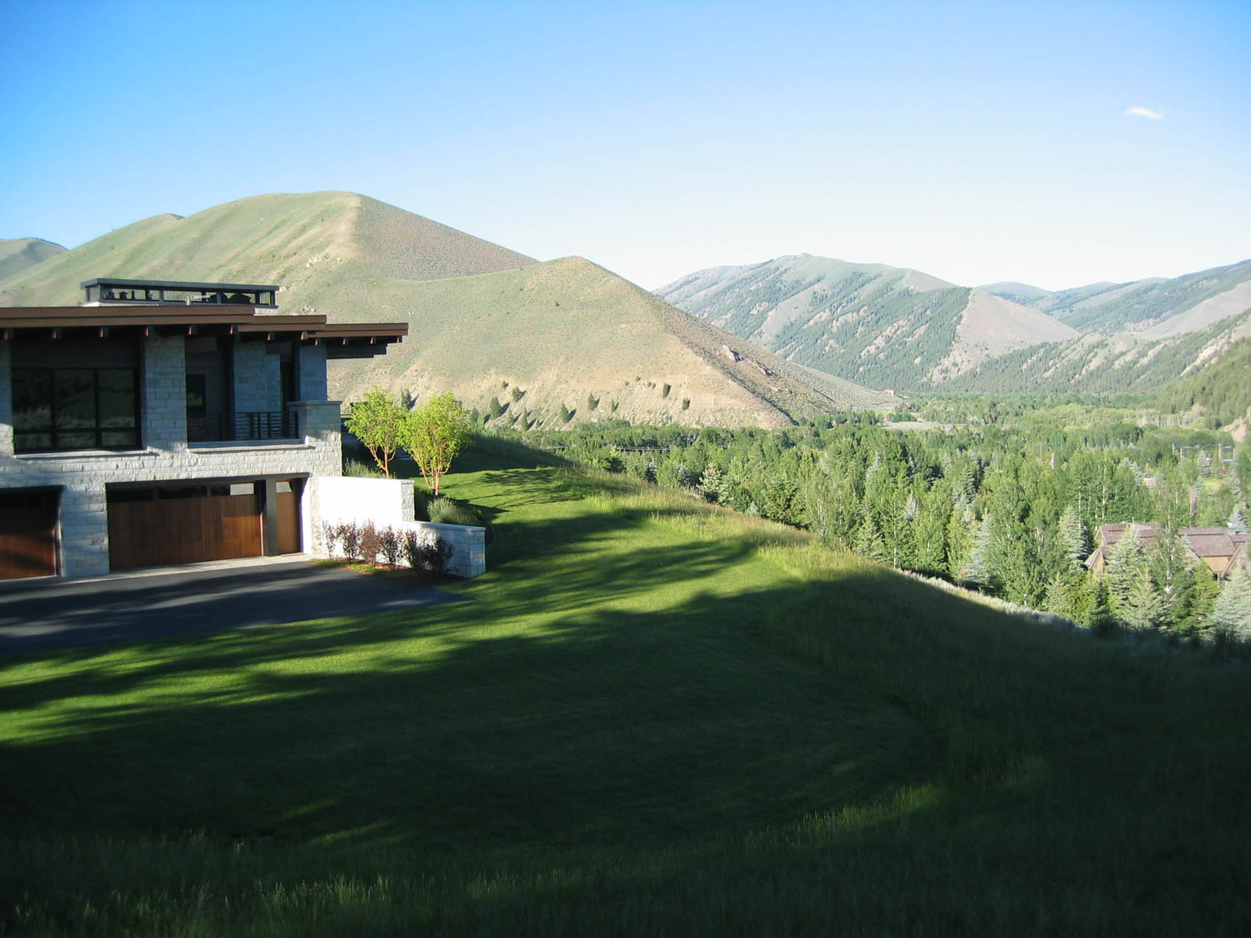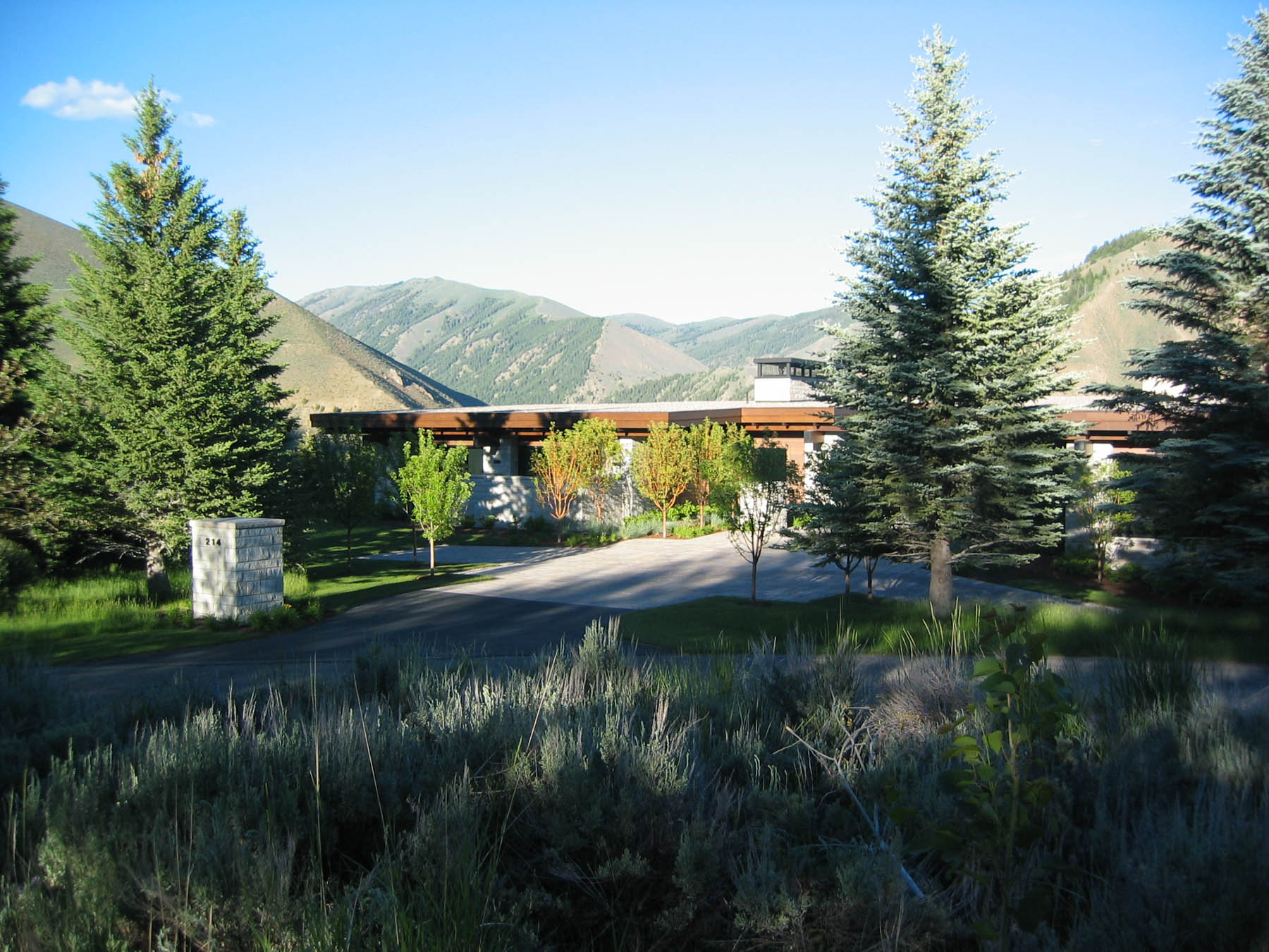 Dramatic views and a contemporary home design grab the attention at this amazing property. An intensive study of the views and sun positions was undertaken to get the house placement perfect. To maximize views the house is elevated and the garage placed underneath. A contemporary custom water feature was designed for the valley facing patio, creating a pleasant pool while eliminating highway noise. The minimalistic, linear approach to the planting design is complimentary to the architecture and maximizes the views. Due to its location close to the forest, “firewise” design was incorporated and tested when the Beaver Creek fire, a large scale forest fire, endangered the property. There is a “water wise” lawn as well, designed for low water use and drip irrigation targets plants with only what water is needed.