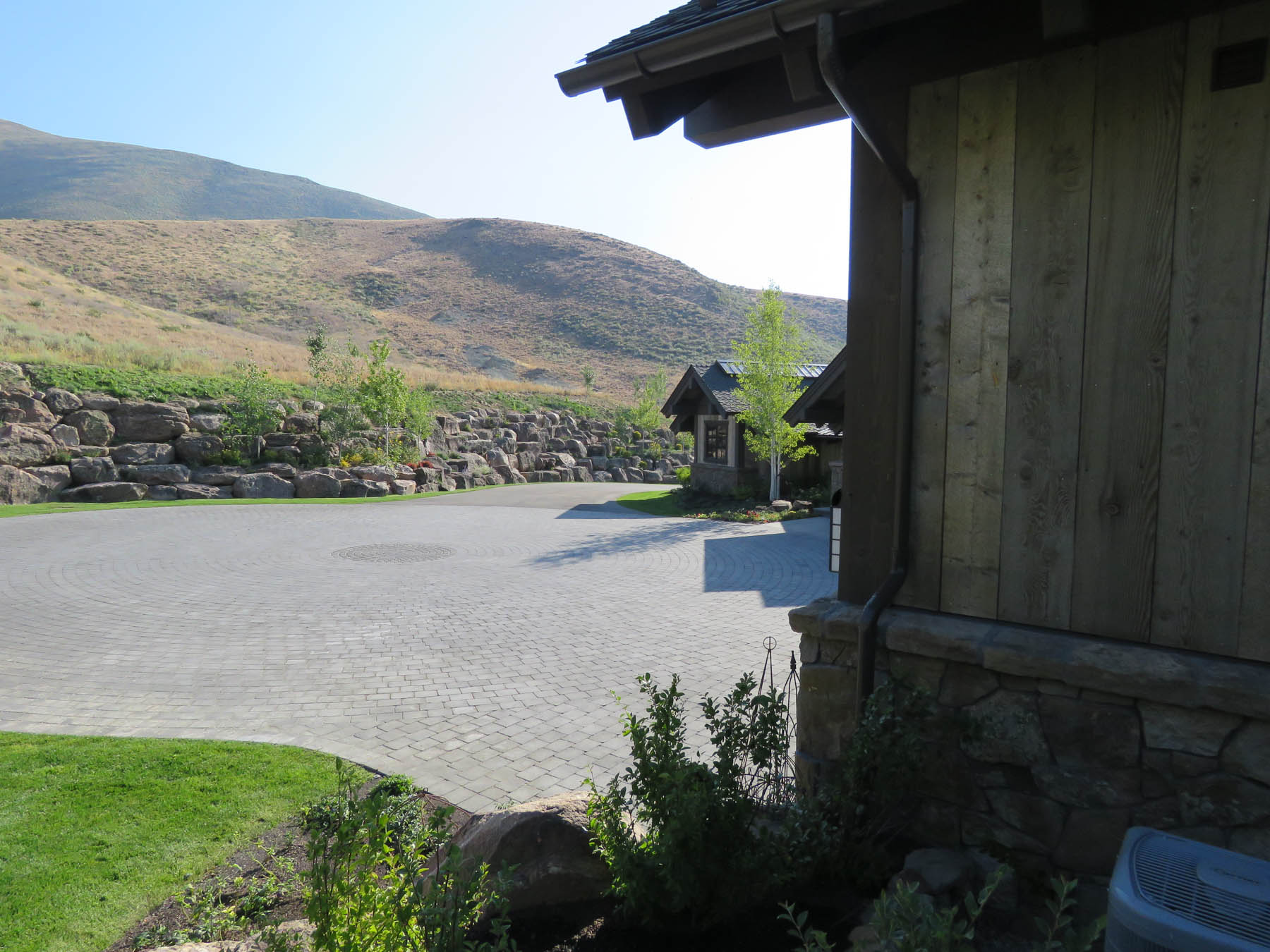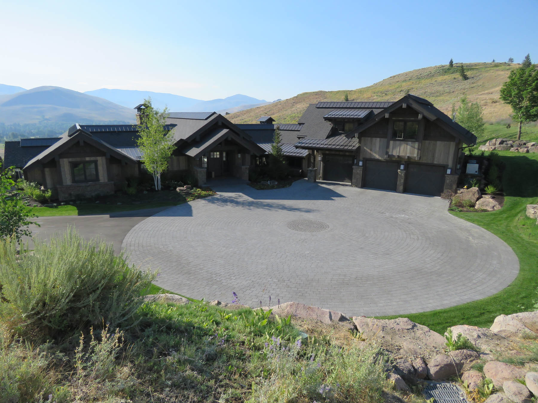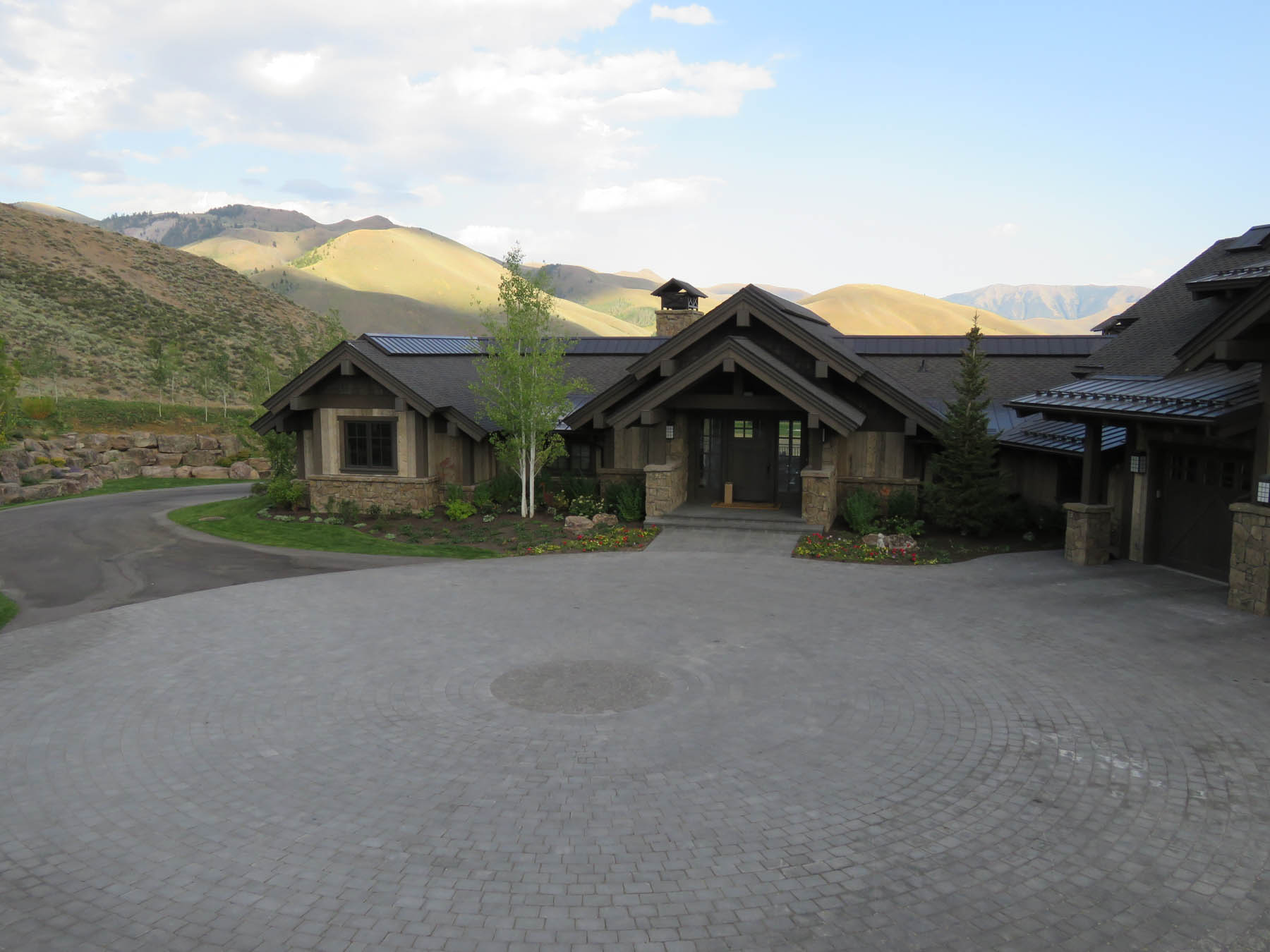 This home had the great challenge of being the first in the newly developed Sun Valley White Clouds. In order to nestle the home into an extremely difficult hillside site, large boulders that match the native landscape were chosen to build retaining walls. In addition, the boulders were placed to mimic natural outcrops and include room for plantings among them. At the end of the day, everything blends seamlessly such that one wouldn’t know the extent of the excavation that had to take place. The site actually played into the owners wish to have additional garages for a car collection by tucking one garage under the house. The careful coordination between architecture and landscape architecture really allows the home to take advantage of sweeping views from property. An extensive outdoor terrace provides a great place to have morning coffee as well as to entertain and relax at the end of another Sun Valley day. A custom designed barbecue area is located off the kitchen with enough space for friends to keep the chef company. A separate patio area has an old steel mining bowl converted to a fire bowl. And a partially sunken hot tub with boulders surrounding provides a relaxing spot to soak. Beautiful large pavers in an ashlar pattern connect all the outdoor spaces together. Landscape lighting subtly highlights the rock walls and patio areas without distracting from the night sky. The care that was taken to design landscaping that fit naturally into the Idaho landscape and would mature to enhance the overall setting sets a high standard for this unique area.