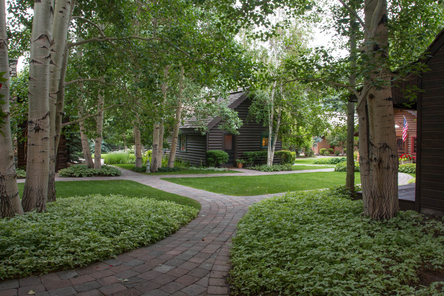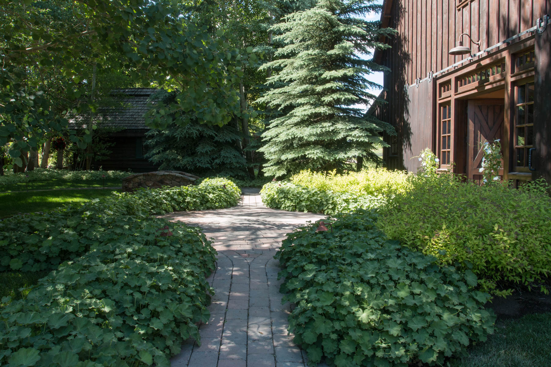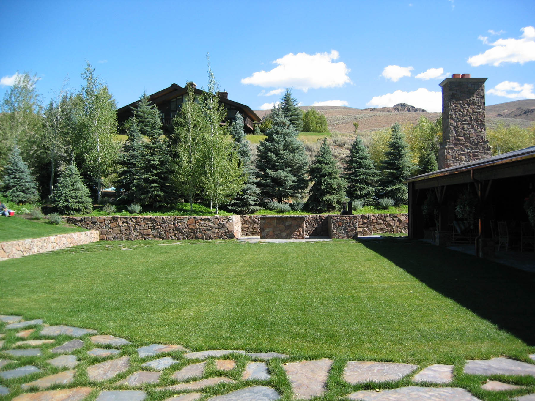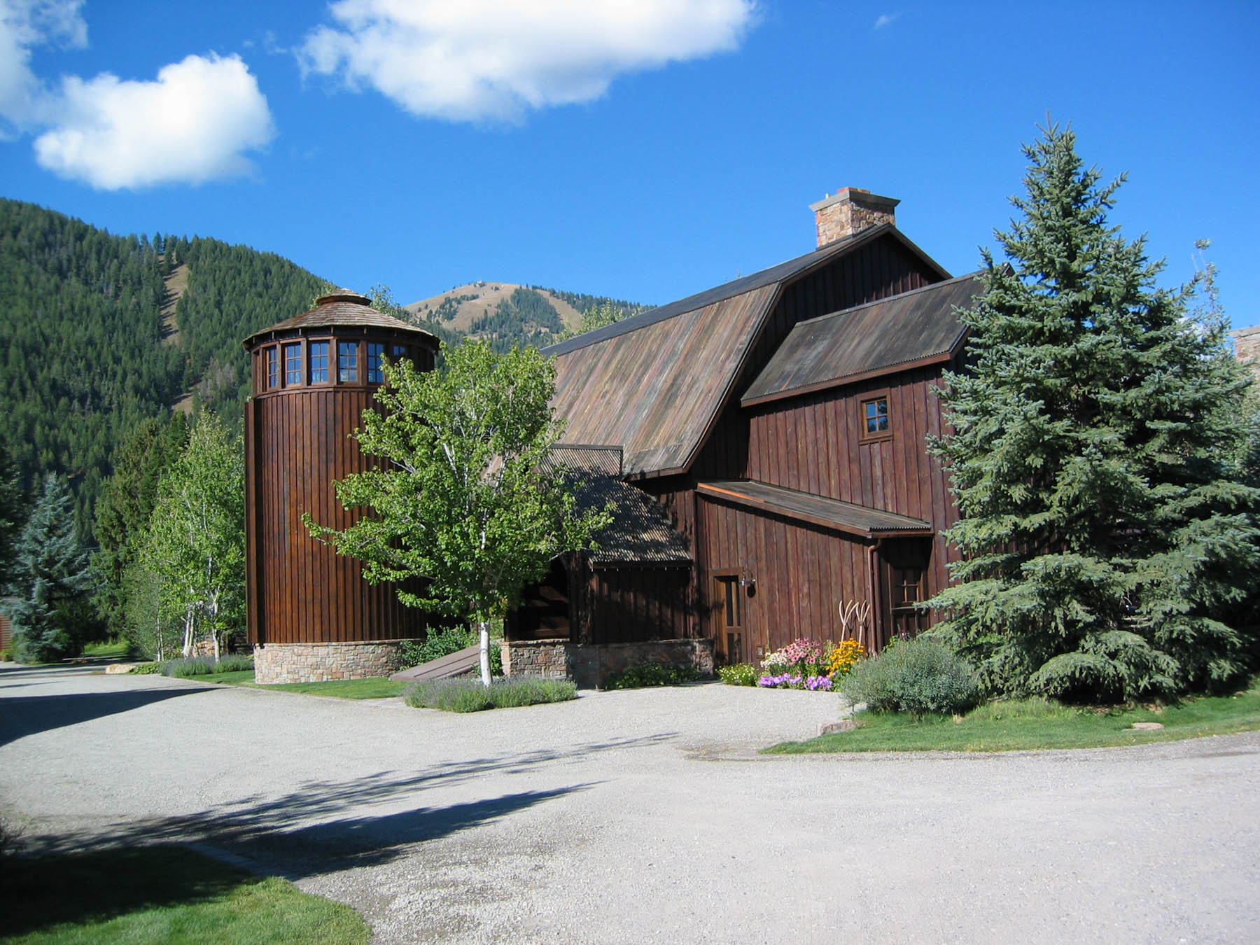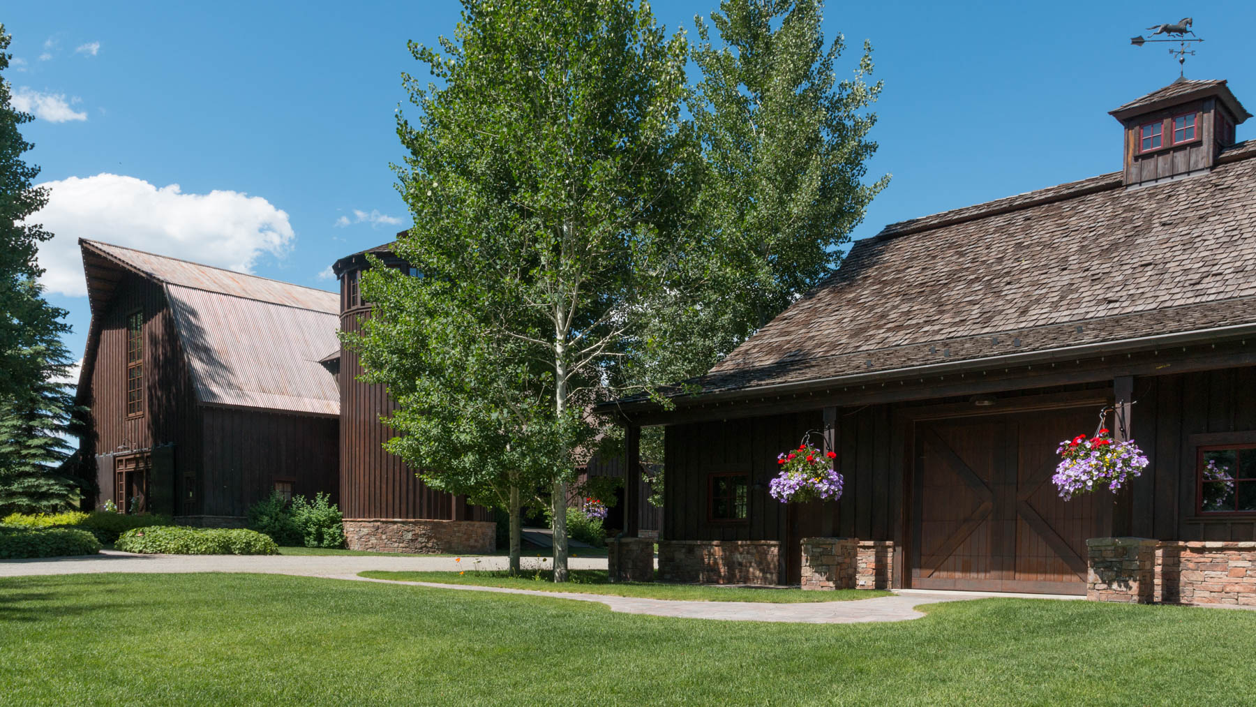 This property, once part of an early Ketchum ranch and agricultural lands, highlights its historical roots by centering attention on a 100 year old barn. The barn was renovated into a modern living and entertaining masterpiece. Above all else the landscape had to stay true to the agrarian theme which meant keeping it simple and not overdone. A covered terrace opens out to a large, elevated event space created with a simple stone wall. This large lawn is perfect for a large party tent when hosting special events. A rustic built fireplace anchors one end and provides a cozy gathering space to reminisce about a busy Sun Valley day. At the other end sits a granite covered bar and custom barbecue grill for hosting large events. Around the corner and off the kitchen is an outdoor sink for caterer’s use. The view to the iconic mountains north of town was maintained and accentuated by the addition of large stone steps. The stream that passes through the property actually goes through one of the cabins where it was used to keep fresh milk chilled. A new horse barn was added to the compound. Eggers Associates designed modern horse paddocks with reinforced surfaces that the horses cannot dig thorough and custom metal fencing they can’t eat. Even the bridge was designed simply in the fashion of the original yet was engineered to support a semi-truck of wine deliveries. Landscape lighting throughout provides a subtle ambiance in both summer and winter. The restored property has been a huge success and hosted many local events including wine auction dinners and other fundraisers.